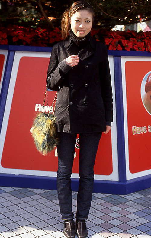 今日はコートを買いに来ました。どんなのを買うかはまだ特に決めてないんですけど、色は黒でシンプルなのを探すつもり。彼氏と一緒に原宿のビームスや渋谷のジャーナルスタンダードなど、いろいろフラフラしようかなぁと思っています。よく行くのは渋谷や代官山で、ズッカ、APC、ジャーナルスタンダード、パルコに行くことが多いかな。雑誌は『spring』と『GINZA』を読んでいます。このバッグはお店で見て、ファーの手触りとか合わせやすい色がかわいいと思って買いました。今は美容関係の短大に行っているので、美容師やヘアメイクさんになるために就職活動中です。ネットはiモードを使用してます。