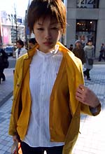 今日はバイトで、公園通りのスターバックスで働いてます。お給料は安いけど、コーヒーの香りに包まれて働きたくって12月から始めました。バイト先の近くのC65カフェもまったりできてお勧めです。好きなブランドはジャーナルスタンダードとスピック&スパン、ベーセーストックなどで、109なんかにもたまーに行ってます。やっぱり渋谷で買い物することが多いかな。1年前ぐらいは典型的な裏ハラ系の格好をしていたんですけど、去年の春から夏にかけてなんとなく今のカンジに変わりました。雑誌は『A-GIRL』や『ar』、『GINZA』を読みます。雑誌を参考にヘアメイクの研究をして、いろいろ自分でアレンジしたりしますね。あとはダイエット&フィットネス雑誌の『FYTTE』!実は体重が6kgも増加してしまって…ローズネットクッキーっていうコンビニで売っているドーナツが大好きで、1日に3〜4個食べたりしてたらこんなことに。X-girlのパンツも入らなくなっちゃったんで頑張ります!このジャケットは色にひかれて購入。もともと暖色系のカラフルな色が好きで、黄色って珍しくって気に入りました。持ってる服もカラフルな色ばっかり、でも形はシンプルなのが好きです。趣味は編物かな。暇つぶしにやっているんですけどまだ始めたばかりでマフラーを編んでいます。この春買おうと思っているのは雑誌で見たスピック&スパンの赤い水玉帽子で、切り替えになっていてかわいいんです。将来は、就職難の今、安定した職につければいいです。