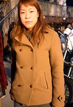今日はロータスにお茶をしに来ました。その後裏ハラ辺りの古着屋さんをまわる予定。よく行くのは原宿と下北です。下北は安くていい物があるし、サイケなお店とかあるので好きですね。百貨店とかファッションビルはバーゲンの時ぐらいしか行かないかも。参考にしているのも街の人や映画で、流行を取り入れるより自分中心の服選びをしているつもりです。このコートは、丈が短くってジャストサイズのものを探している時に、ヨーロッパちっくなボタンにひかれて買いました。雑誌は立ち読みとかで『mini』や『spring』をみて、趣味が音楽なので『米国音楽』を買っています。音楽は洋楽を幅広く聴くんですけど、ジェーンバーキンやゲーンズブール、ブリジットバルドー等のフレンチポップが好きです。レディオヘッドやビョークなんかも聴きますよ。先日ビョークの『ダンサーインザダーク』を観たんですけど、とても良くって泣いてしまいました。他にはもともと美術関係が好きなので、大学のサークルで美術部に入って油画を描いてます。将来はグラフィックデザイナーになりたいですね。