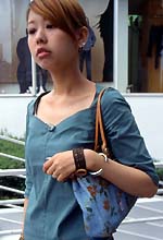 ラフォーレのKOJIKUGAで働いていて、今は休憩中です。仕事の時は休憩中に原宿をぶらぶらすることが多くて、ナンバー44をよく覗いたりしています。休みの日は代官山に買い物に行ってWRとかを見ますよ。以前はマルタンマルジェラが好きだったんですが、恵比寿にオンリーショップができてからは行かなくなりました。雑誌は『mini』や『GINZA』を読んでいます。スカートだけじゃ寂しいし女の子っぽくなりすぎるので、スカート+パンツのコーディネートにしました。普段からスカートだけではくことはなくって、スパッツに合わせたりもしていますよ。でも仕事で動きやすいように、パンツをはくことが多いですね。5年ぐらい前から独学でパソコンをいじっていて、今はiBookとiMacを持っています。ホームページを作ったり、友達のバンドのフライヤーやポストカードを作って友達のショップに置いてもらったりもしてるんですよ。近い将来、デザイン事務所に入ってグラフィックデザインの仕事がしたいな、と考え中です。