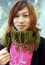 何かはおるものが欲しくなって買いに来ました。カーキ色のリブが付いているジャンパーとかいいですね。ジップアップで、シブめな感じので、素材はシャカシャカするやつかナイロンかコットン。予算的には1万円ぐらいのものを探してます。今、フラッグスのタワーレコードで『zipper』を立ち読みしていて、ちょっといい感じのものを見つけたので、これから高島屋に見に行くところです。ブランドでは、アンドエーが好きですね。今日着ているものもほとんどアンドエー。あと、友達が着ていたアースミュージック&エコロジーもカワイイと思う。自分では買わないけど、新宿の伊勢丹や原宿のフォレットに入っているショップは見に行きます。メンズは着ません。いつから着なくなったかと言うと…高1の時はヴォンテージファッションだったので、高2の時が変わり目だったかもしれない。話とかしてても女の子とのほうが合うんですよね…。『zipper』や『CUTiE』はよくチェックするけど2冊とも買いません! 気になるモノが載っていた時は、問合せ先の電話番号を携帯にメモるから買うことない!このマフラーは、偶然ショップで見つけて、欲しくなったので買いました。横にフリンジが付いていてカワイイし。結構、雑誌に載っていたかもしれない…。フランドルに就職が決まったんです! こうなったら“販売職”を極めたいですね。フランドルという会社の考え方や、方針が好きなのでうれしい!悩みは、今住んでいるアパートの給湯機が古くて、お風呂やシャワーのお湯が水になっちゃうこと! この時期はツライ!!