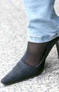 定番の黒パンプスには、色落ち加工ジーンズとのコーディネートで...