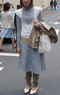 レイヤードの上に重ねたトップスの襟刳りがVゾーンを形成しているもの。