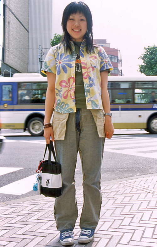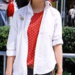 いちばん上にシャツを着用している女性すべて。シャツの定義は、衿があり、前後の身頃と前立て、袖で構成されてトップスで、前はボタンで全開するもの。ただし、色や柄、素材、袖の長さ、丈は問わない。