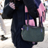 A アウターを着ていて肩にかけるとかさばるから自然とマダム持ちに。緑のアイテムが欲しかったのと生地がかわいいから。編みっぽい生地になっています。