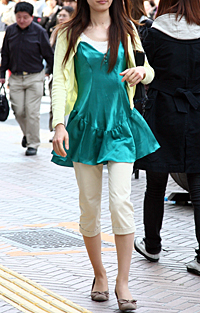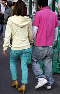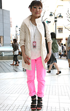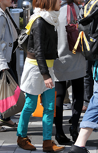 カラースキニーはギャル系を中心に人気。裾をロールアップして七...