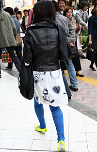 ヴィヴィットカラーのレギンスと蛍光イエローのパンプスの組み合...