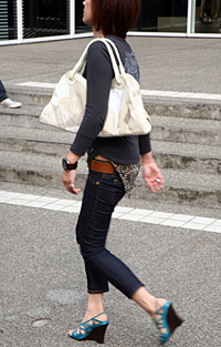 ヒールのあるストラップ靴。ヒールは3センチ以上。