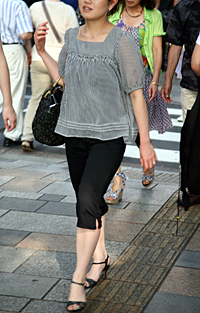 丈が七分丈よりもやや短いボトムスのすべて。色やデザイン、素材は問わない。上にいかなるトップスまたはワンピースを重ねていようと、またいなかろうと問わない。