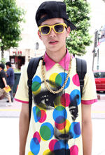 最近スクエア型のサングラスをしている人が多いので、人とかぶらなくて個性が主張できる丸みのあるデザインのものを買いました。黄色い洋服が多いので、サングラスも合うように黄色を選んだんです。今日みたいなカラフルなコーディネート以外に、モノトーンのコーディネートの時にも合わせます。
