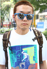 買ったばかりなので、今日はサングラスを中心にコーディネートしました。ふだんわあまりサングラスはかけません。これを買ったときは、夏だからブルーを選びました。太めのデニムをはく事が多く、今日のデニムは自分のなかでは細い方です。