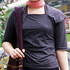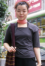 もともと黒が好きで、最近スカーフとかを合わせて工夫するようになりました。その日の気分によって、自分でいろいろやってみます。今日の気分はうしろ。タイで買ったエスニックバックも、黒に合わせるといいな、と思いました。