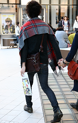 チェック柄のストールは男性にも人気。ポンチョのように肩に掛け...