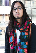 巻きものは古着です。色と大きさが気に入りました。ストールが派手なのでごちゃごちゃしないように全体のバランスを気を付けてます。巻き物はマフラーを合わせて4つくらい持ってます。寒くなるとよく活用します。ほかにも落ち着いた色のストールを2枚と、真っ赤なストールを1枚持っています。