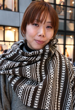 A 巻きものはジャーナルスタンダードで買いました。無地の服が多いので、何か柄のアイテムが欲しかったんです。アウトドアや山っぽいものも気になりました。このストールを巻くと、ボリューム感を上に持っていくことができるので、普段のコーディネートに変化をつけられて重宝しています。