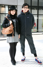 ダウンジャケット+ハイカットスニーカーのスポーティーなスタイ...