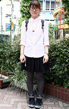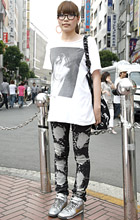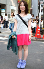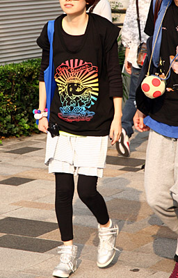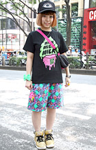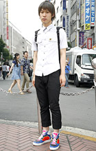 カラフルなスニーカーをハズしとして取り入れたスタイル。原宿で...