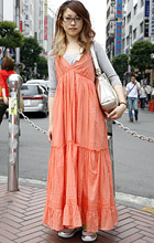 淡いカラーのマキシ丈ワンピースにあえてカラフルスニーカーを合...