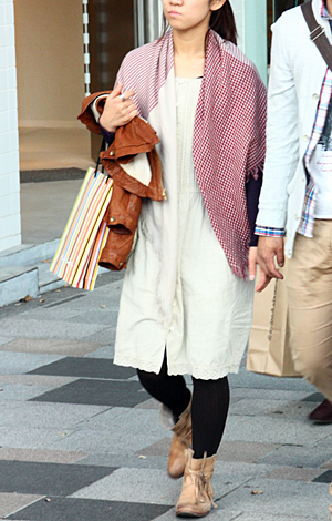 ナチュラルなコットンワンピースやストール、ぺたんこブーツは森...