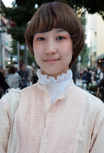 今日は学校のコンテストに出るモデルの子に合わせて、自分もコーディネートしました。普段はボーイッシュな格好もします。流行っているからこういう格好をしているわけではなくて、2年くらい前からこの系統の服装は着ています。色々着てきて自然にいきつきました。最初に着てみたときに自分に合っていたし、着心地もよかったです。最終的には、チベットやアフガニスタンなどの民族衣装的なものを着たいですね。布一枚を巻きつけるシンプルなスタイルがいい。ミックススタイルで自分らしいスタイルに着こなしたいです。チークたかめが流行っているので、シャドーをほほに持ってきています。