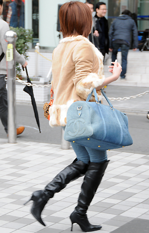 ジーンズのブーツインがニーハイブーツで復活している。表革のニ...