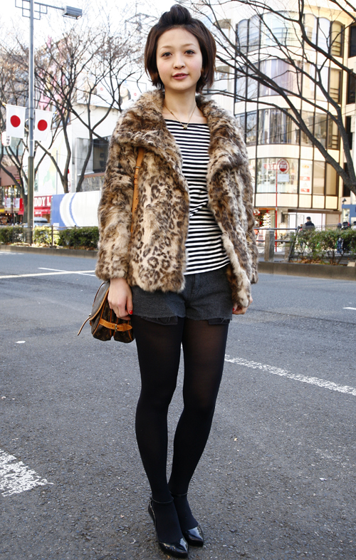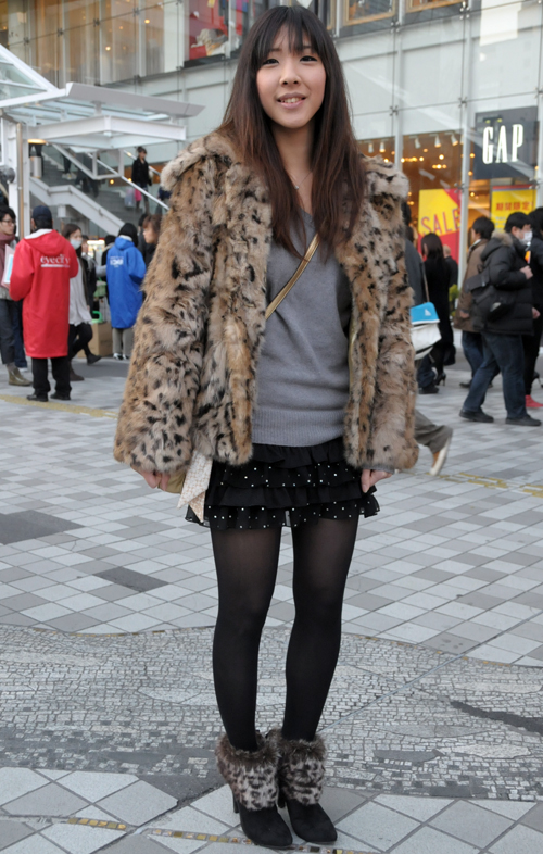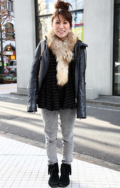 首のまわりにファー素材の何らかのものを巻いていたり、ファーやボア素材がトップスの襟元に顔を覆うように用いられているもの。色や柄は問わない。