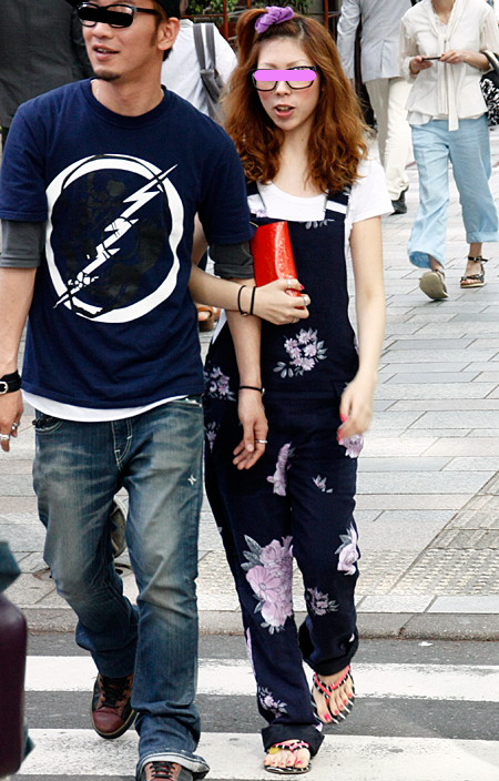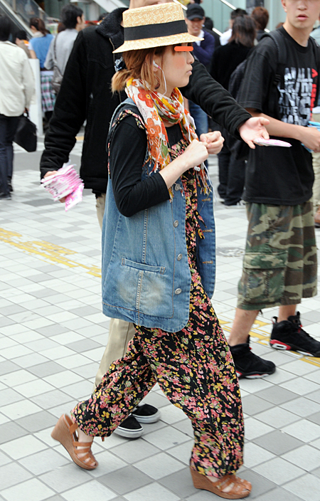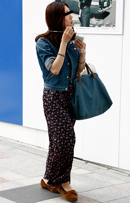 原宿では柄のオールインワンが支持されていた。濃紺に大きな花柄...