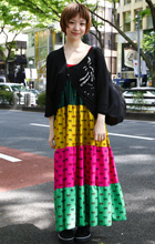 90年代生まれらしい色×柄のポップなマキシドレス。黒と合わせ...