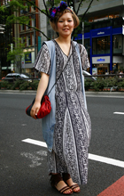 柄のオールインワンに柄の巻物をプラスしたスタイル。柄on柄コ...