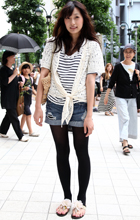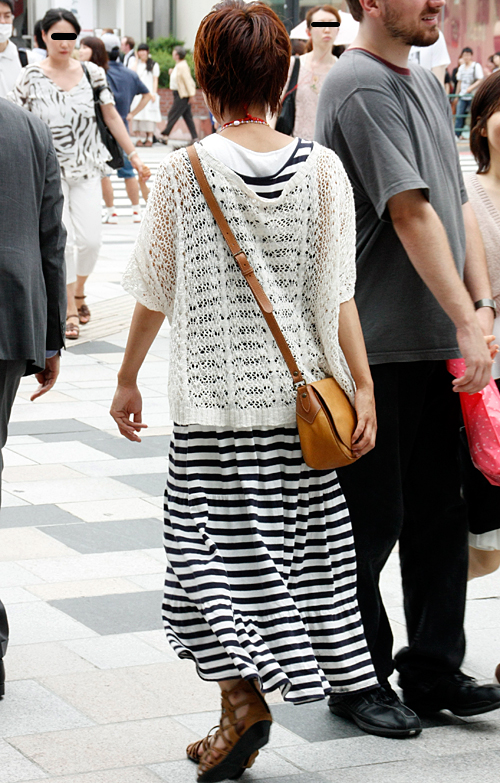 ボーダーにカギ針編みのトップスを重ね、柄のレイヤードを見せた...
