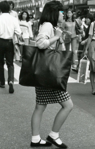 B4以上の大きさで、重心が腰より上に来るような持ち手の短いもので、肩に掛けているもの。ショッピングバッグ類でなければ素材は問わない。