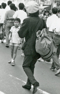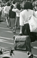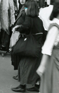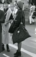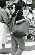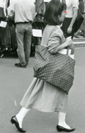 B4以上の大きさで、重心が腰より上に来るような持ち手の短いもので、肩に掛けているもの。ショッピングバッグ類でなければ素材は問わない。