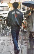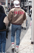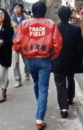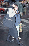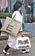 トップ、ボトム、バッグ、帽子について、1文字3cm角以上の大きさのアルファベットが2文字以上並んでいるもの。靴、靴下、紙袋は除く。略称(LV、PHなど)は除く。