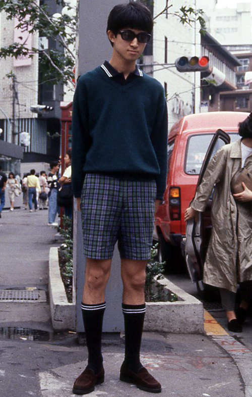 革製(合皮も含む)の靴と、綿麻素材の無地のトランクス型の膝丈パンツを合わせているもの。