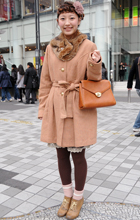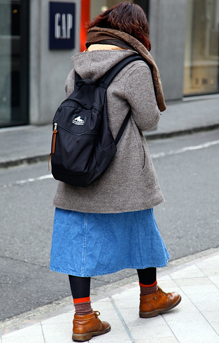 ダッフルコートや膝下丈のデニムのスカート、リュックなどローテ...