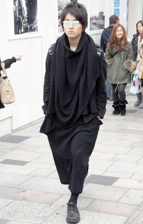全身黒、ドレープや切り替えを多用したゆったりとしたシルエット...