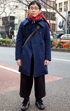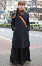 ロングコートに幅広いクロップトパンツを合わせた80sモードな...