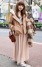 ベージュ系のショート丈コートとマキシスカートの組み合わせが非...