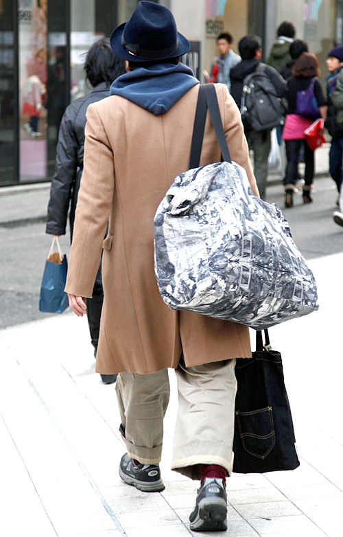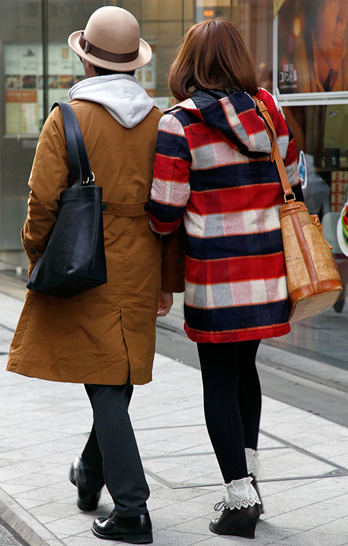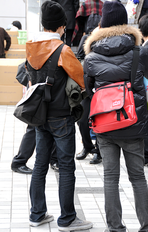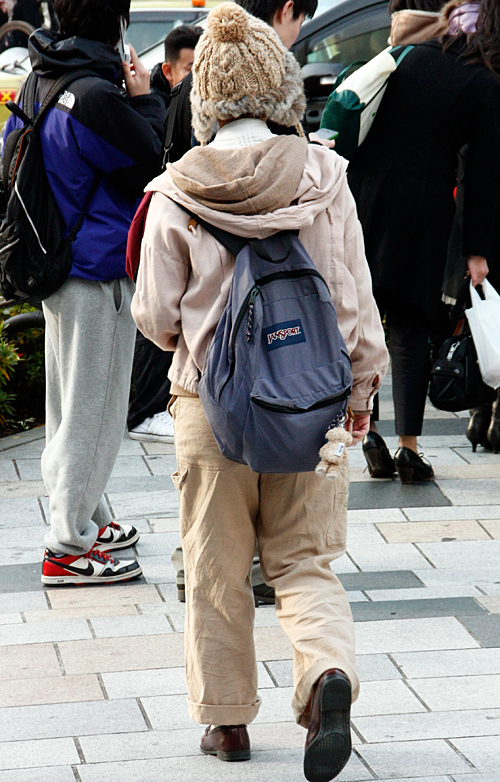 防寒と兼ねてアウターのフードを頭にかぶるスタイルが男女共に増...