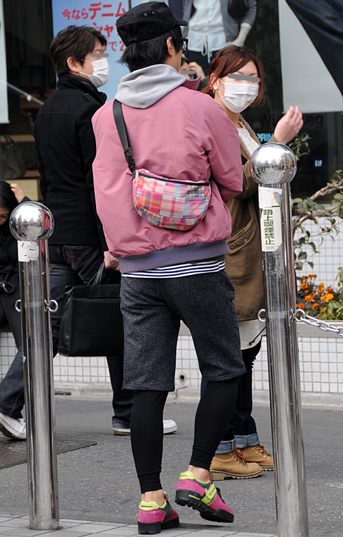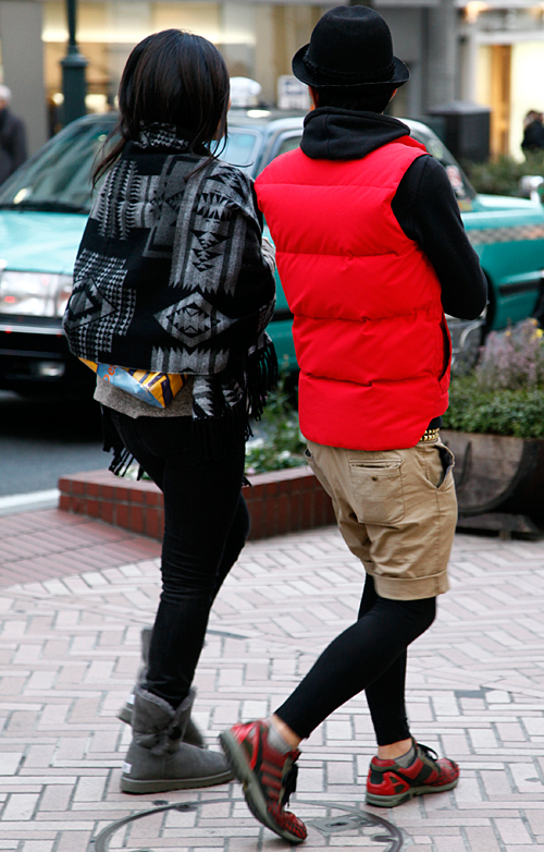 +帽子とフード付きパーカーonダウンベストがレギンス男子の今...