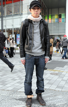 レザーブルゾン+パーカーに、スキニーデニムをブーツインしたU...