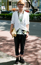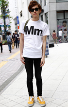 刈り上げ+眉も脱色して外国人のような雰囲気に。Tシャツ+チノ...