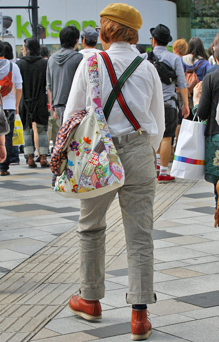 スラックスやサスペンダーなどメンズアイテムでおじさんのような...