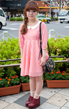 バッグを低い位置に下げてワンピースのボリュームを抑えたスタイ...