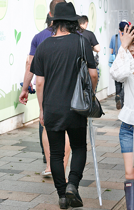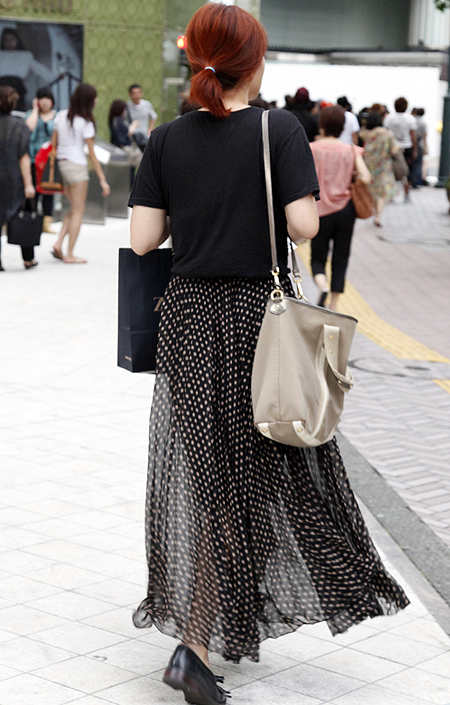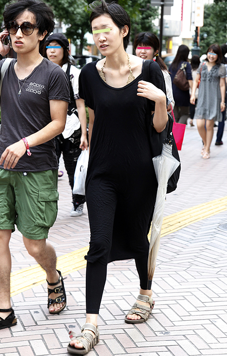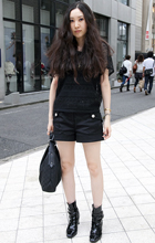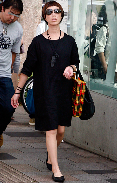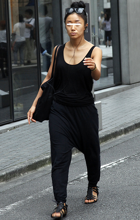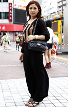 ネックレスも時計もバッグも黒。スリムなIシルエットのアジアン...