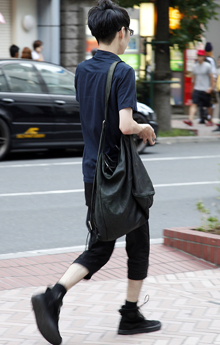 刈上げヘアがアジアンな印象の彼。紺×黒のコーディネートは今秋...