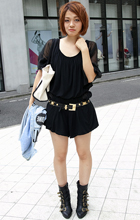 黒コーディネートはミニ丈で足を露出して軽さを出したスタイルが...