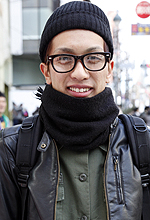 ニット帽だけだと足りないのでメガネをかけました。黒いニット帽しか持っていないので暗めですね。この二つを合わせるときはファッションも暗めにします。何かをイメージしたわけではなくて、セットで用いているだけです。流行っているようにも思います。