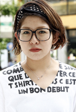 スキニーは1年前に妹に借りてずっとはいています。自分でもスキニーは持っていますが、こればかりはいています。古着のTシャツやJeffrey Campbell(ジェフリーキャンベル)の靴に合わせたりします。レザーっぽく見えますが動きやすくて気に入っています。青か赤などの原色のカラースキニーも欲しいです。黒のボトムスをはくことが多くて、上はお尻が隠れるか隠れないかくらいの大きめのTシャツをあわせます。Tシャツと靴を目立たせたいのでボトムスはシンプルなものを選びます。とにかくラフにシンプルに見せたいです。以前は、タイトスカートが多かったのですが、1年前からはずっとスキニーを履いています。