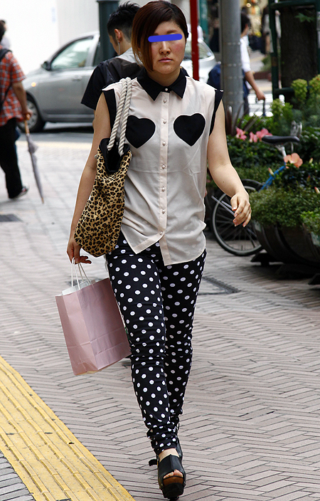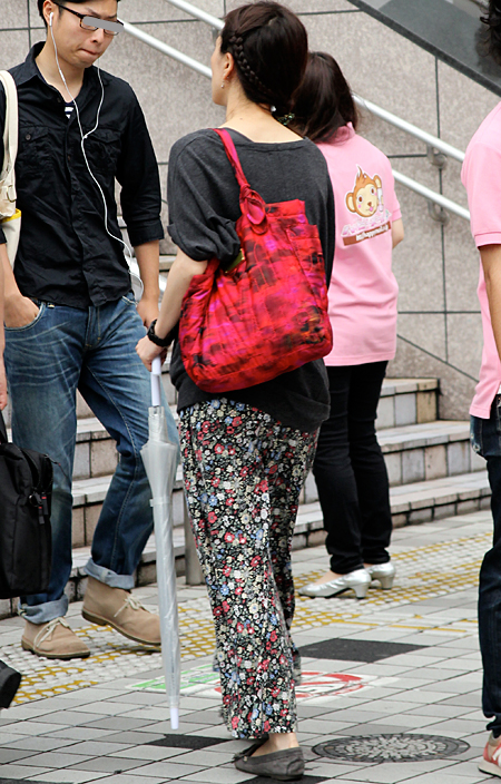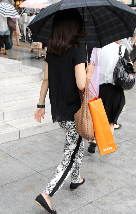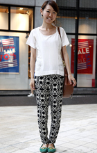 柄パンツに合わせるトップスは白か黒が多い。小物も黒でシャープ...
